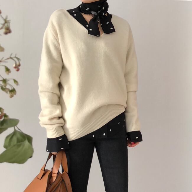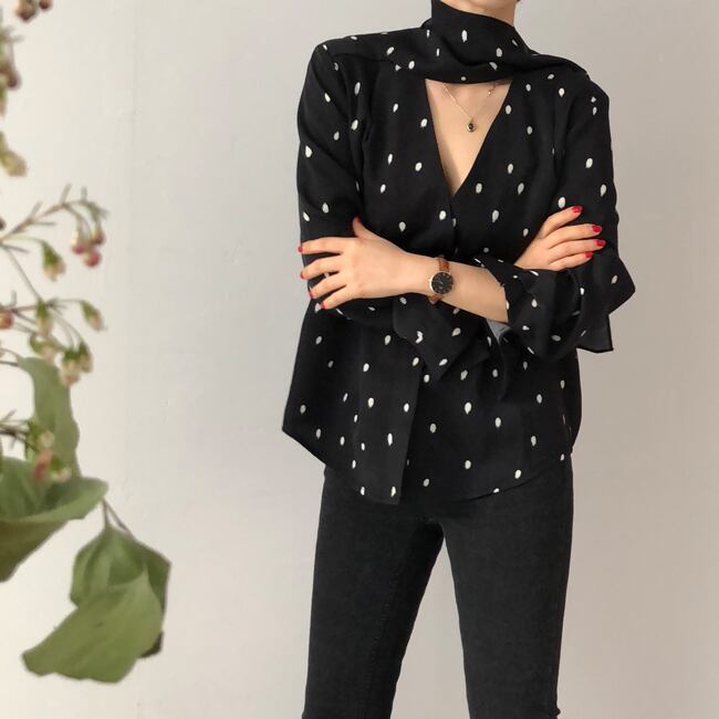 一体型ボウタイブラウスになります。リボンにしたり首にくるっと巻いたりイメージを変えて着こなしのバリエーションを楽しんで下さい。